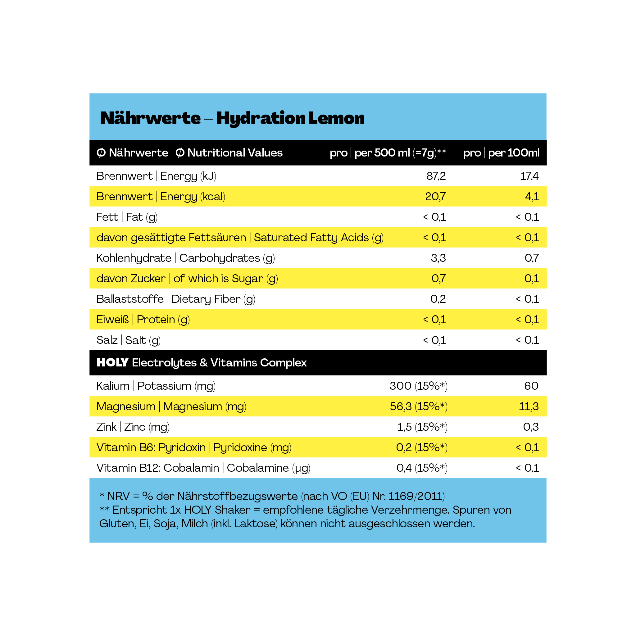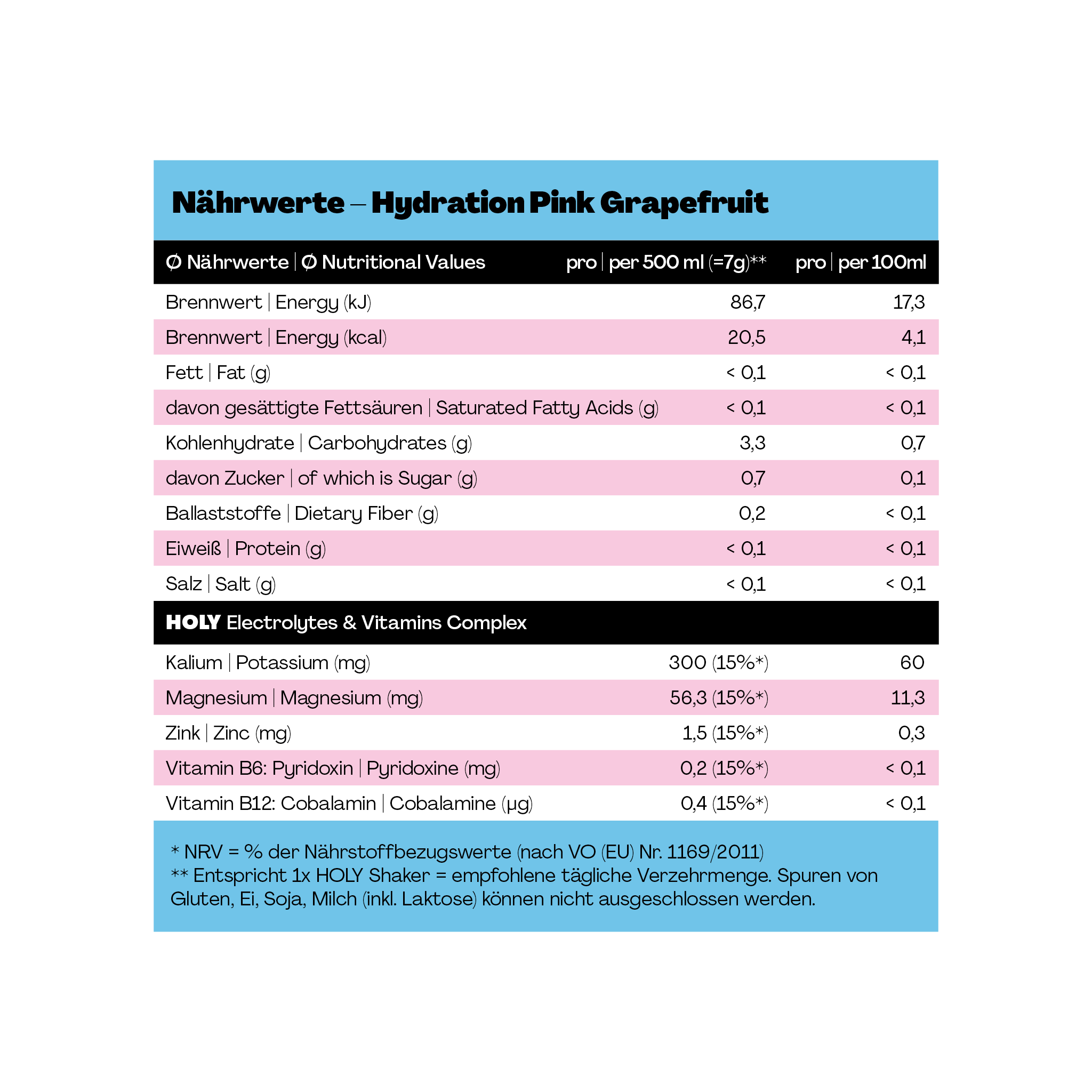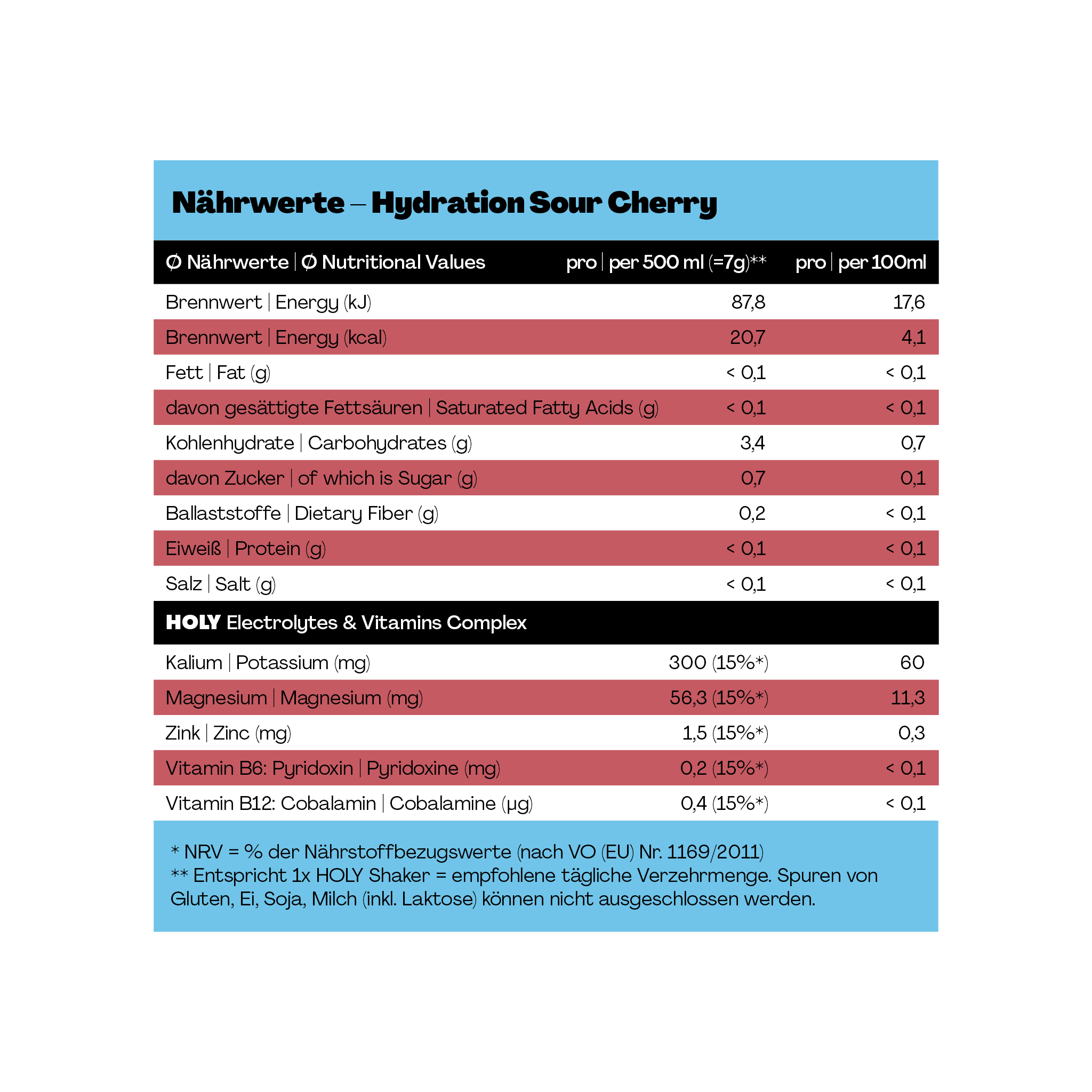 HOLY Hydration ist unser Sportdrink für aktive Momente – mit geilem Geschmack und gutem Gewissen! Pro 500 ml enthält HOLY Hydration nur 0,7 g Zucker – und zusätzlich Elektrolyte & Mineralstoffe.