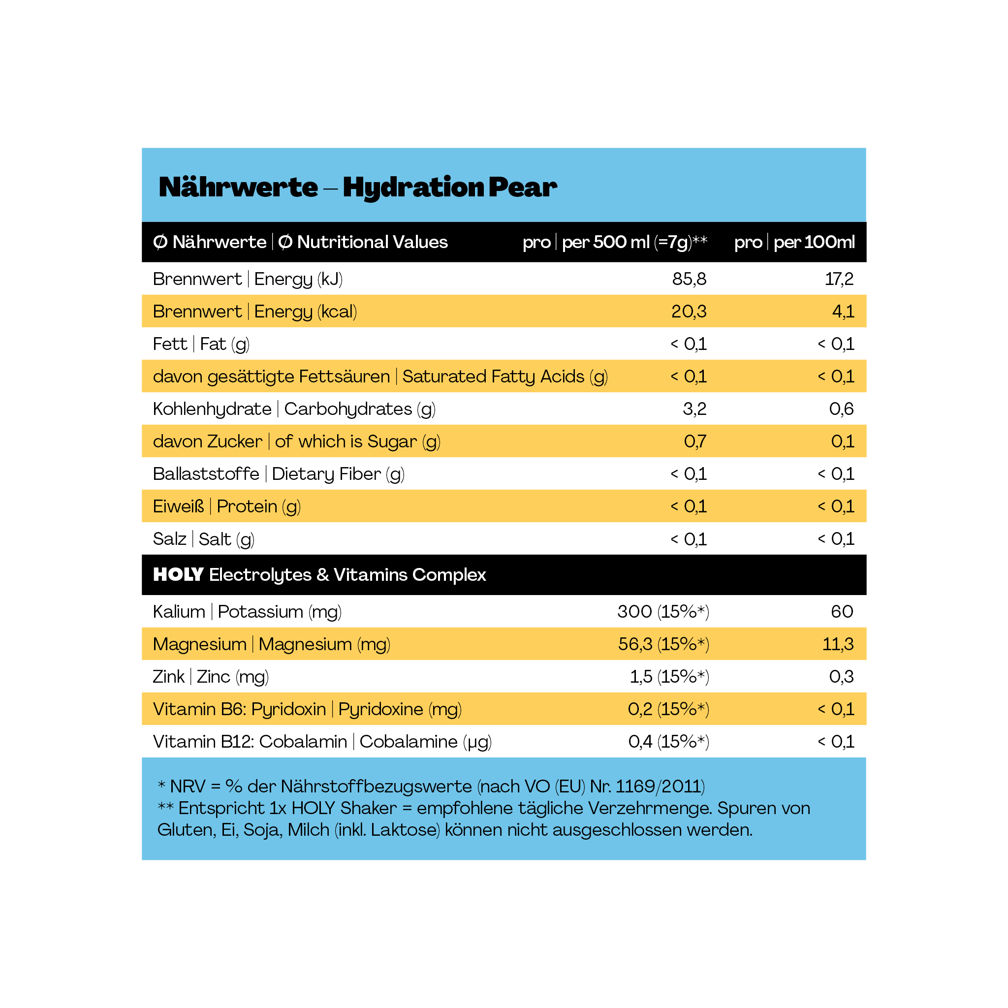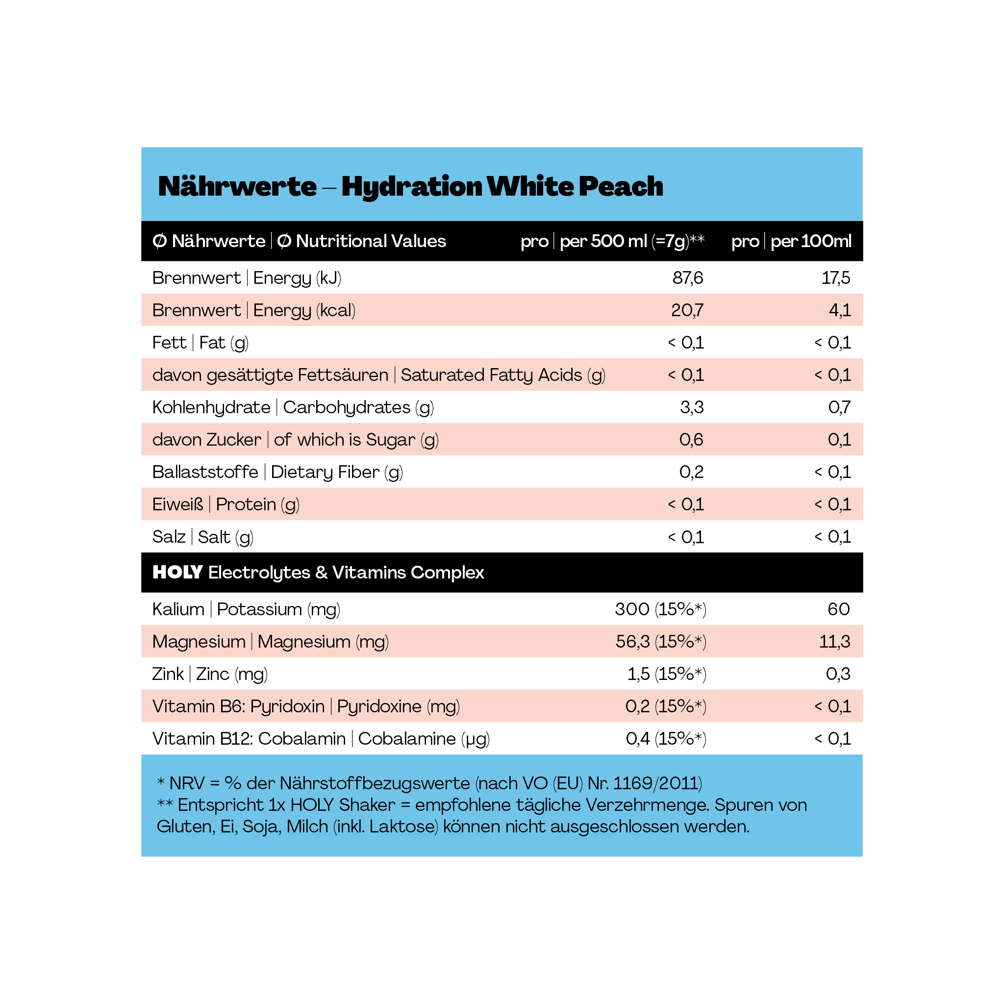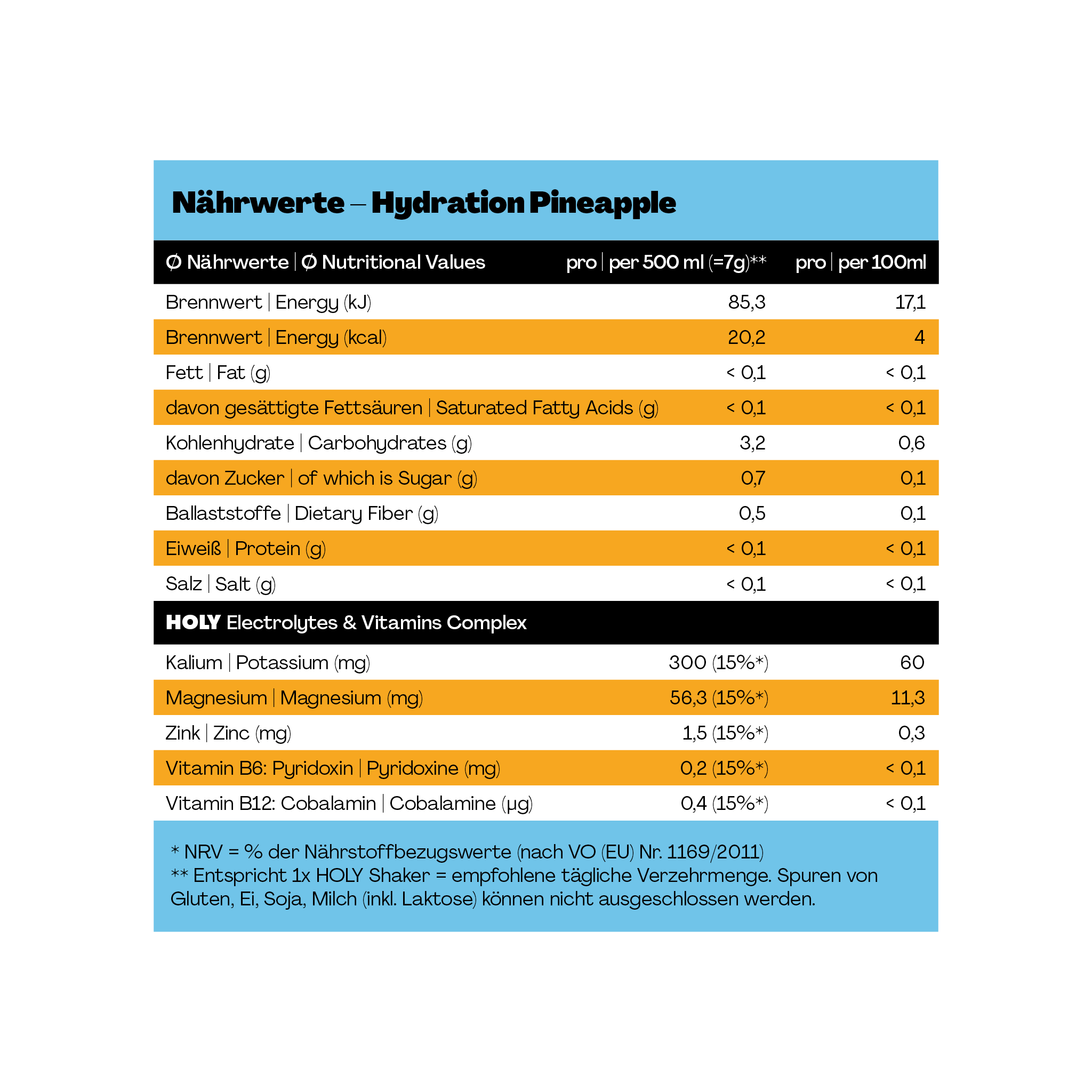 HOLY Hydration ist unser Sportdrink für aktive Momente – mit geilem Geschmack und gutem Gewissen! Pro 500 ml enthält HOLY Hydration nur 0,7 g Zucker – und zusätzlich Elektrolyte & Mineralstoffe.